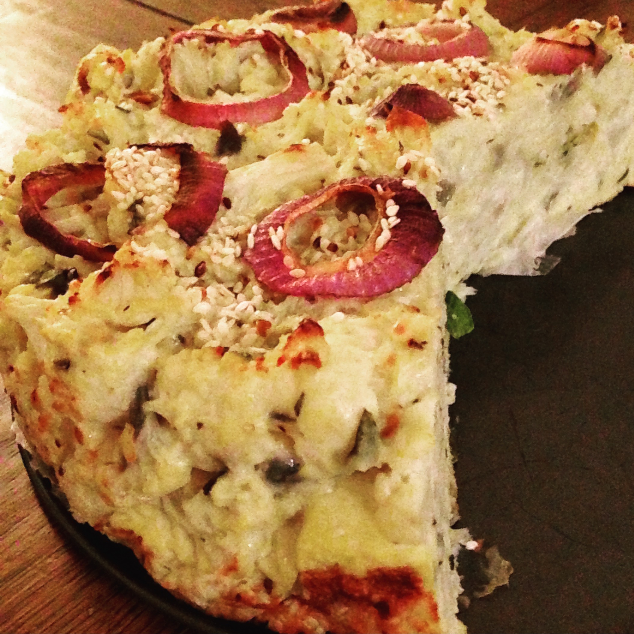 Deze goddelijke taart ziet er niet alleen heel mooi uit door de rode uienringen op de gele taart.. en hij is goddelijk! Een knipoog naar de klassieke bloemkool met kaassaus! Ik heb hem gegeten met een simpele salade van verse spinazie. Hij is trouwens koud ook heel erg lekker! Hij is erg solide, dus je kunt hem gemakkelijk meenemen als lunch, of er hele kleine stukjes van snijden als hapje bij een borrel of buffet.