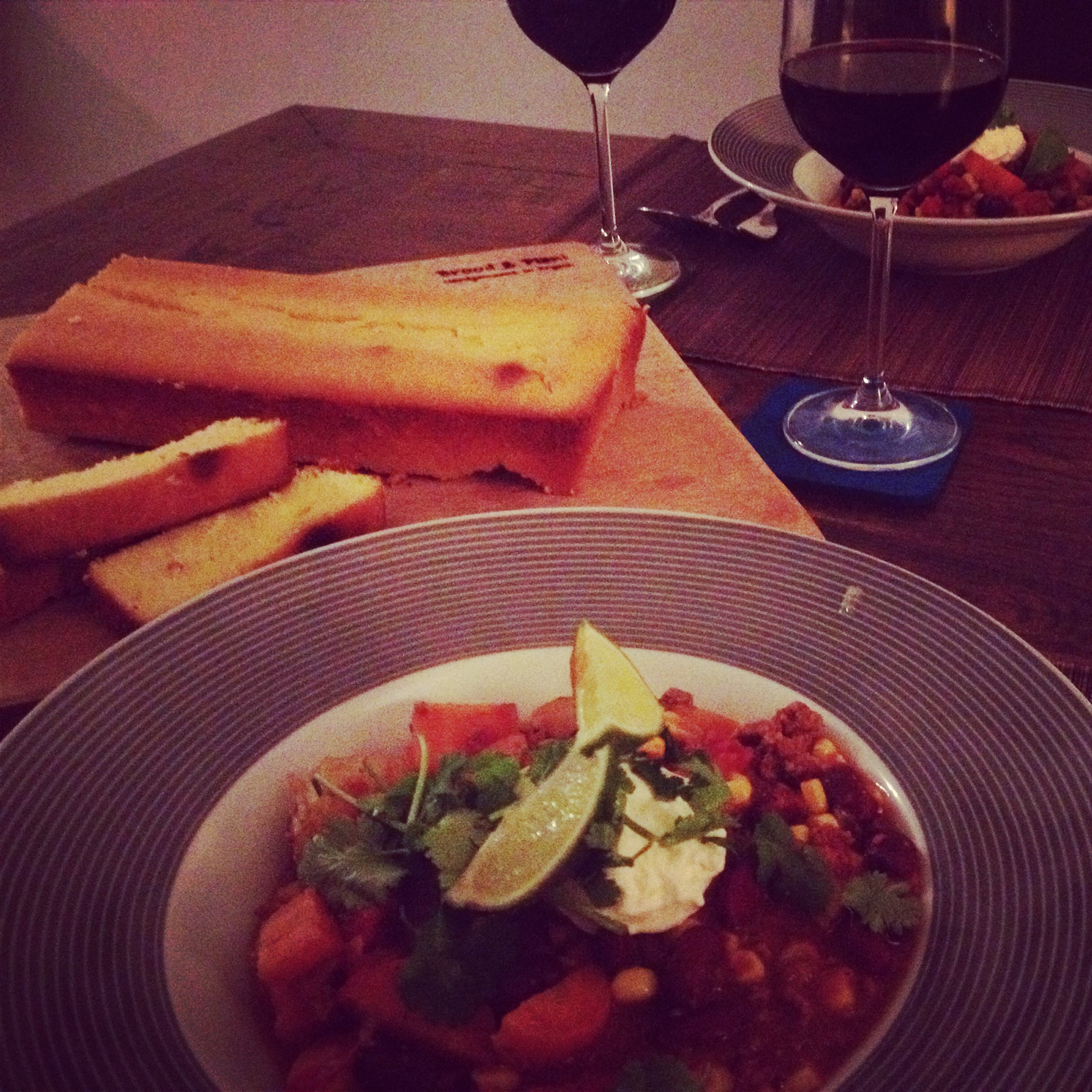 Bereidingstijd: 30 minuten (+ 1 uur pruttelen) voor de chili, 5 minuten (+ 35 minuten oven) voor het maisbrood en
