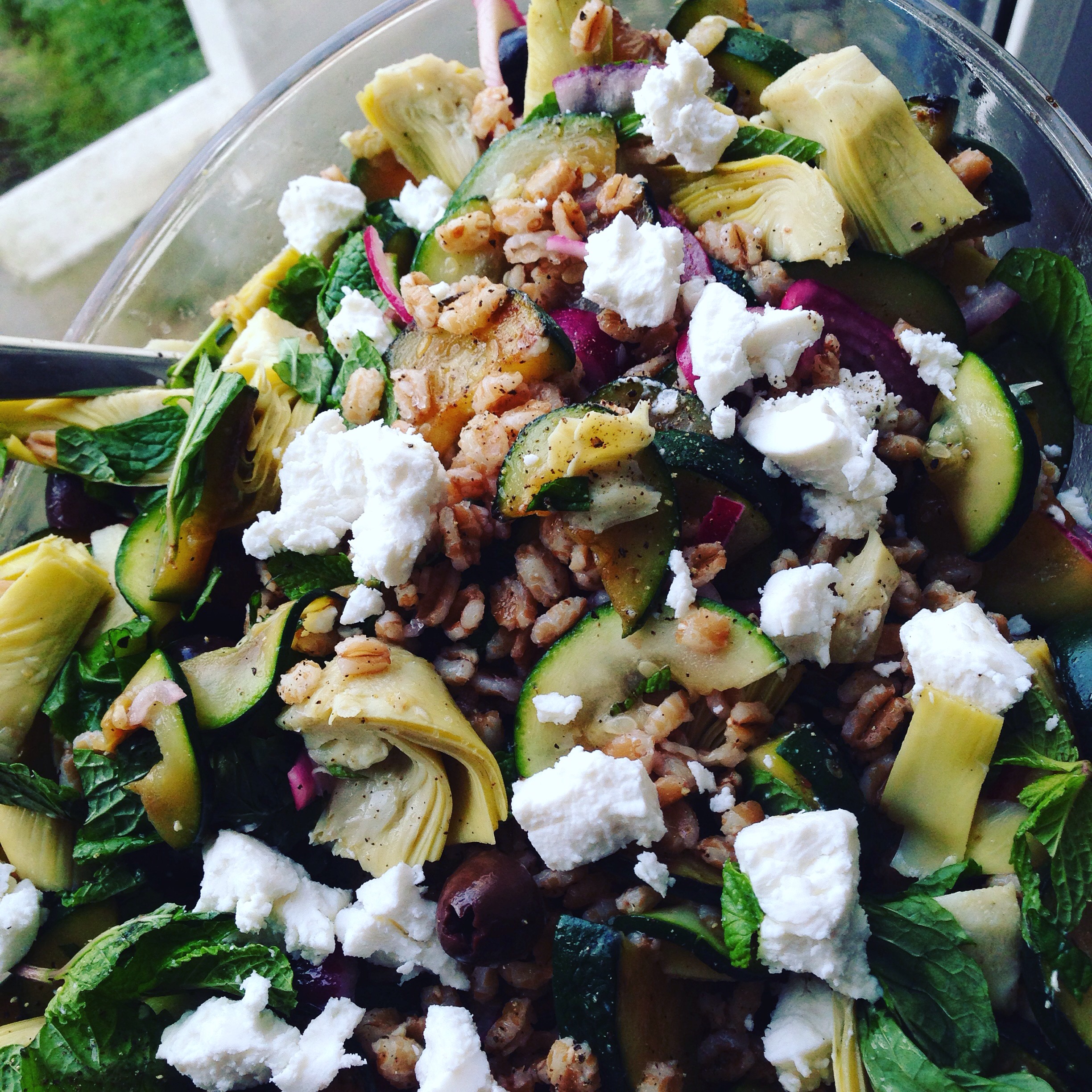 Meng de farro, courgette, artisjokken, rode ui, munt, olijven door elkaar en breng op smaak met olijfolie en citroensap. Bestrooi met stukjes geitenkaas en verse peper.