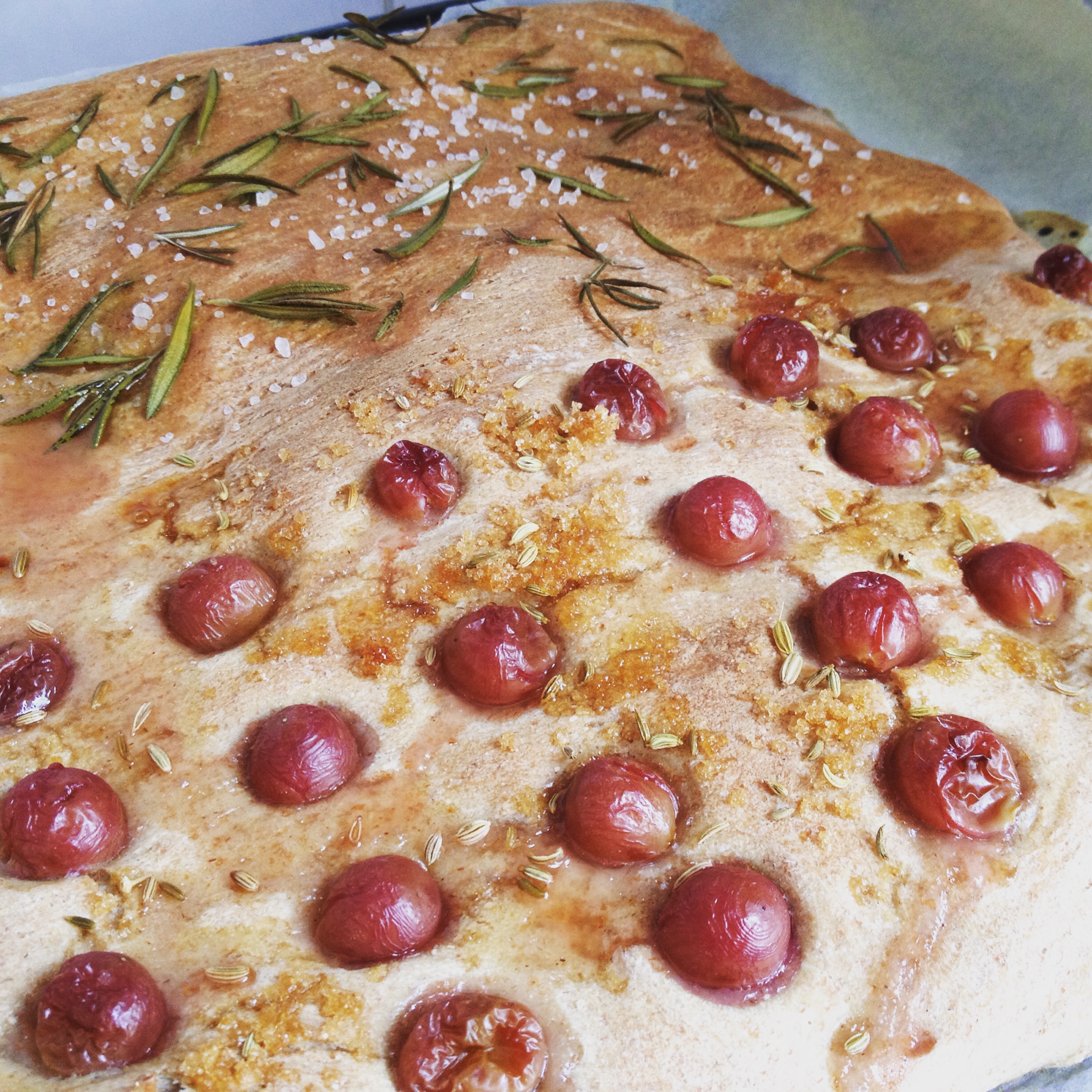 Verhit de oven op 220 graden. Meng voor de druiventopping de suiker met het venkelzaad. Druk de druiven in het deeg en bestrooi met het suikermengsel. Druk in de andere helft de takjes rozemarijn, bestrijk met olijfolie en besprenkel met grof zeezout. Zet de focaccia in de oven en bak hem 10 minuten. Schakel terug naar 190 graden en bak hem nog 15-20 minuten. Controleer of de onderkant van het brood droog is. Haal het uit de oven en bestrijk de rozemarijnkant opnieuw met olijfolie.