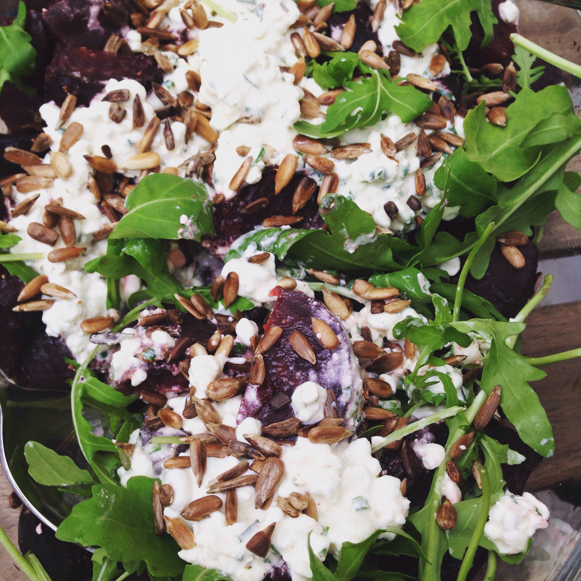 Serveer de bietjes als ze lauwwarm zijn met wat rucola en schep daar de hüttekäse en pitjes overheen. Je kunt de bietjes ook laten afkoelen en dan alles samenvoegen als je de salade pas de volgende dag wilt gaan eten!