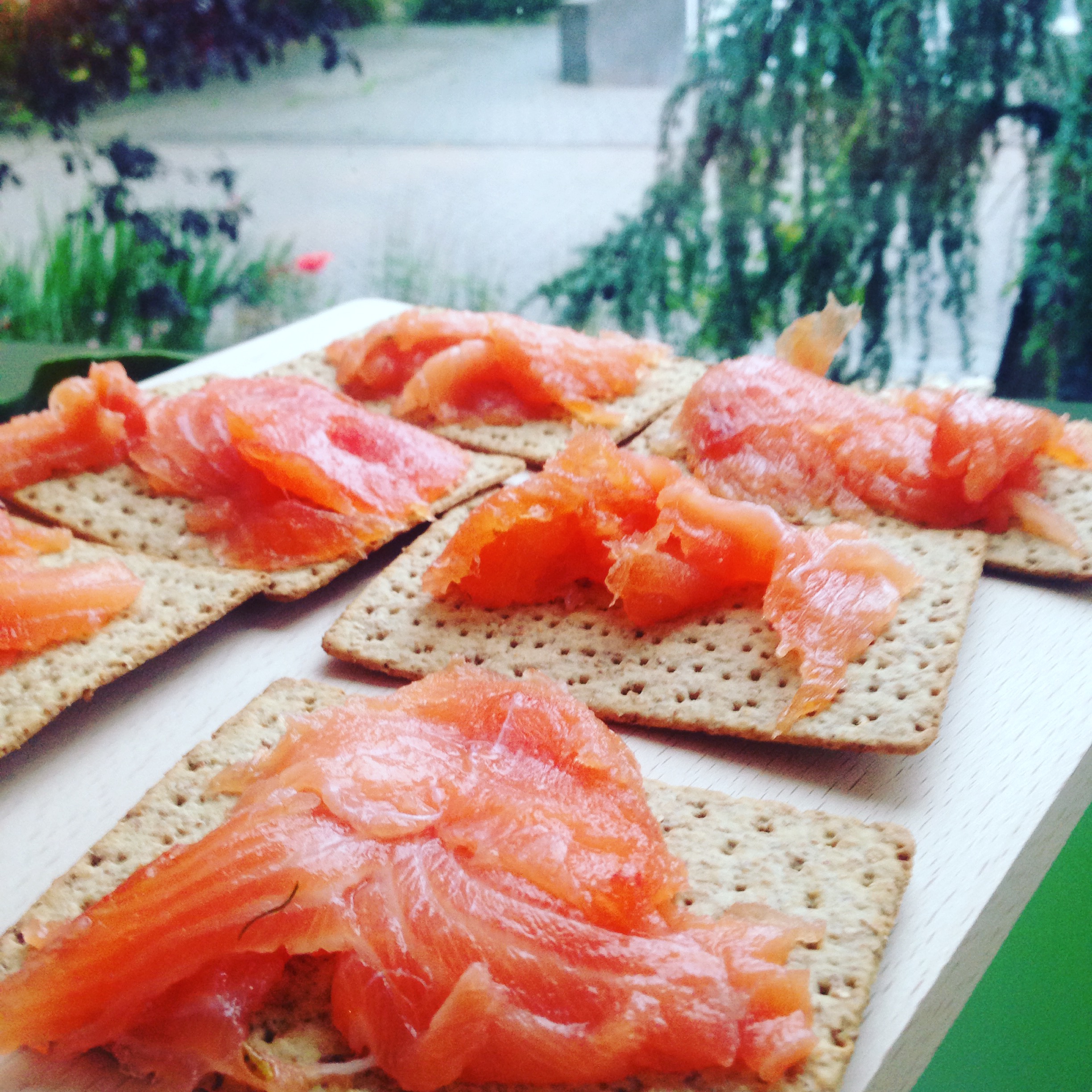 Als je de zalm gaat serveren als aperitief, doe dit dan op heel dun knäckebröd of de dunne crackers die ik op de foto gebruik (van de Lidl, heerlijk!). Of met een slaatje van dun gesneden venkel en citroensap!