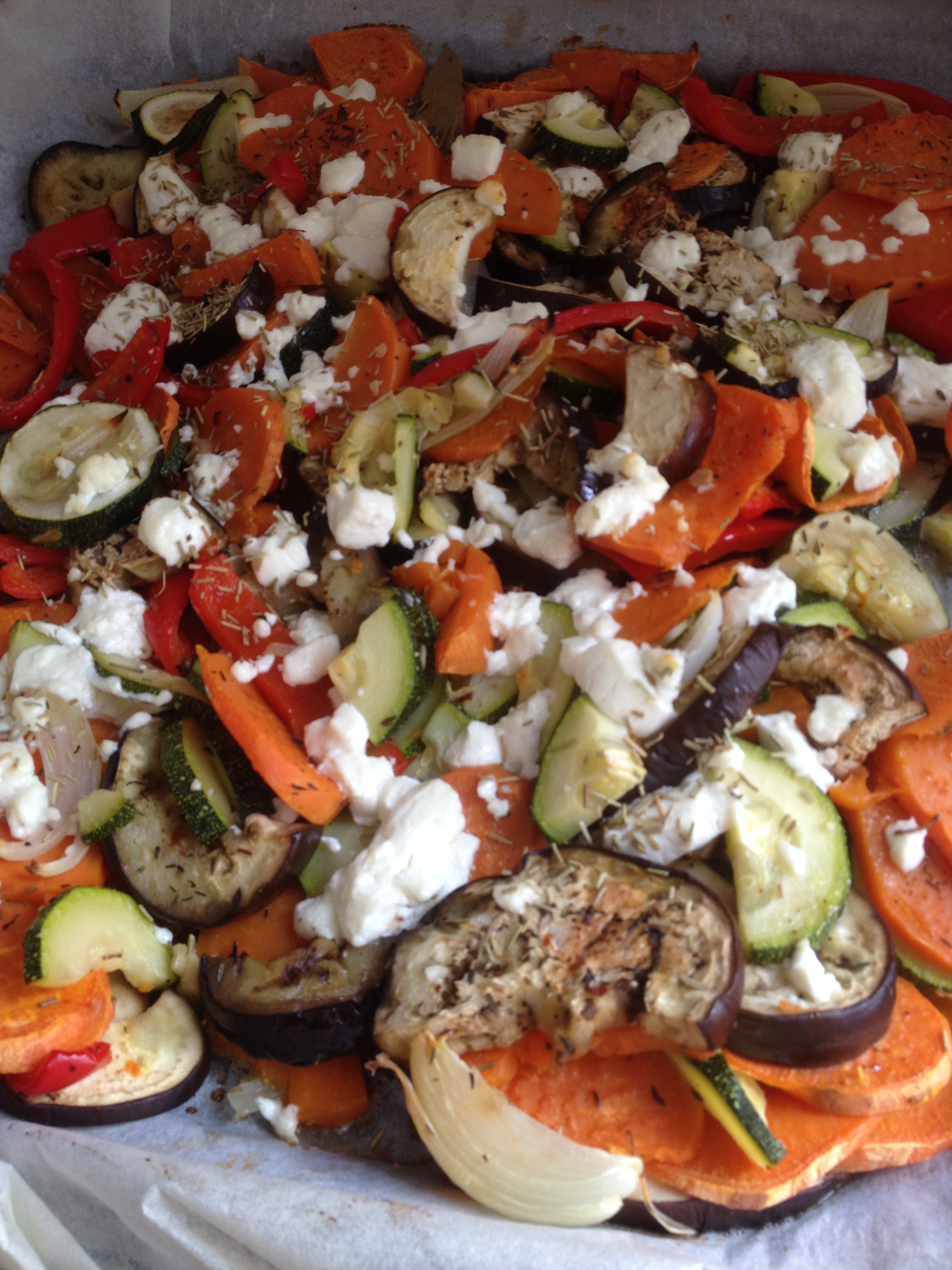 Verwarm de oven voor op 200 graden. Was alle groenten en snijd ze allemaal in grove stukken. De schil kun je gewoon om de zoete aardappel laten zitten want die is hartstikke voedzaam! Verdeel de groenten met de in grove stukken gesneden uien over de bakplaat en strooi hier de blaadjes van de takjes rozemarijn, peper en zout overeen. Besprenkel met olijfolie.
