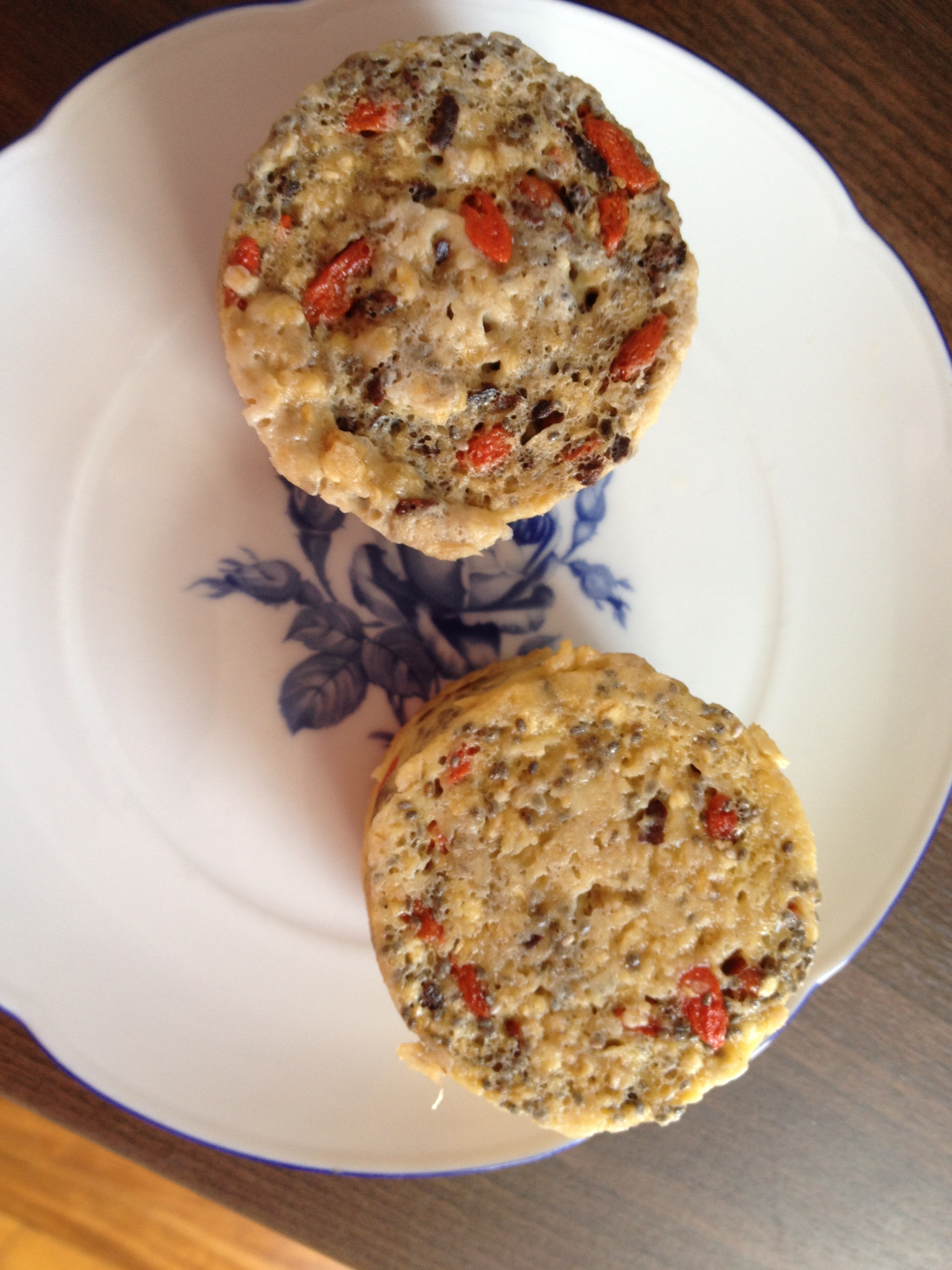 Dit zijn de gemakkelijkste cakejes ooit. Het enige dat je nodig hebt is een mok, een magnetron en twee minuutjes. De cakes worden erg solide dus je kunt ze gemakkelijk meenemen tijdens het sporten. Maar als ontbijt met een beetje yoghurt of kwark kan natuurlijk ook!