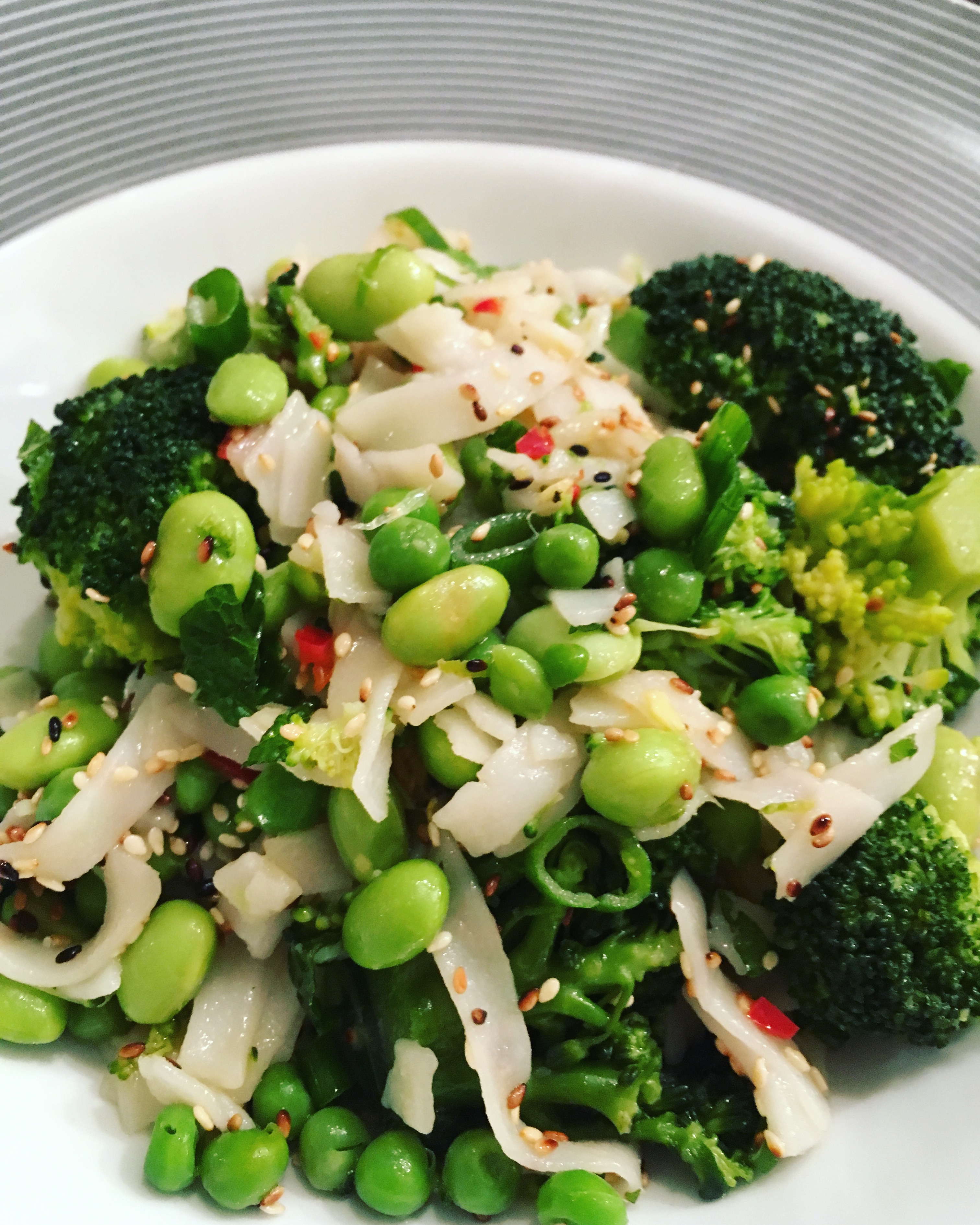 Lunchsalade met broccoli, doperwtjes, pistachenootjes en feta