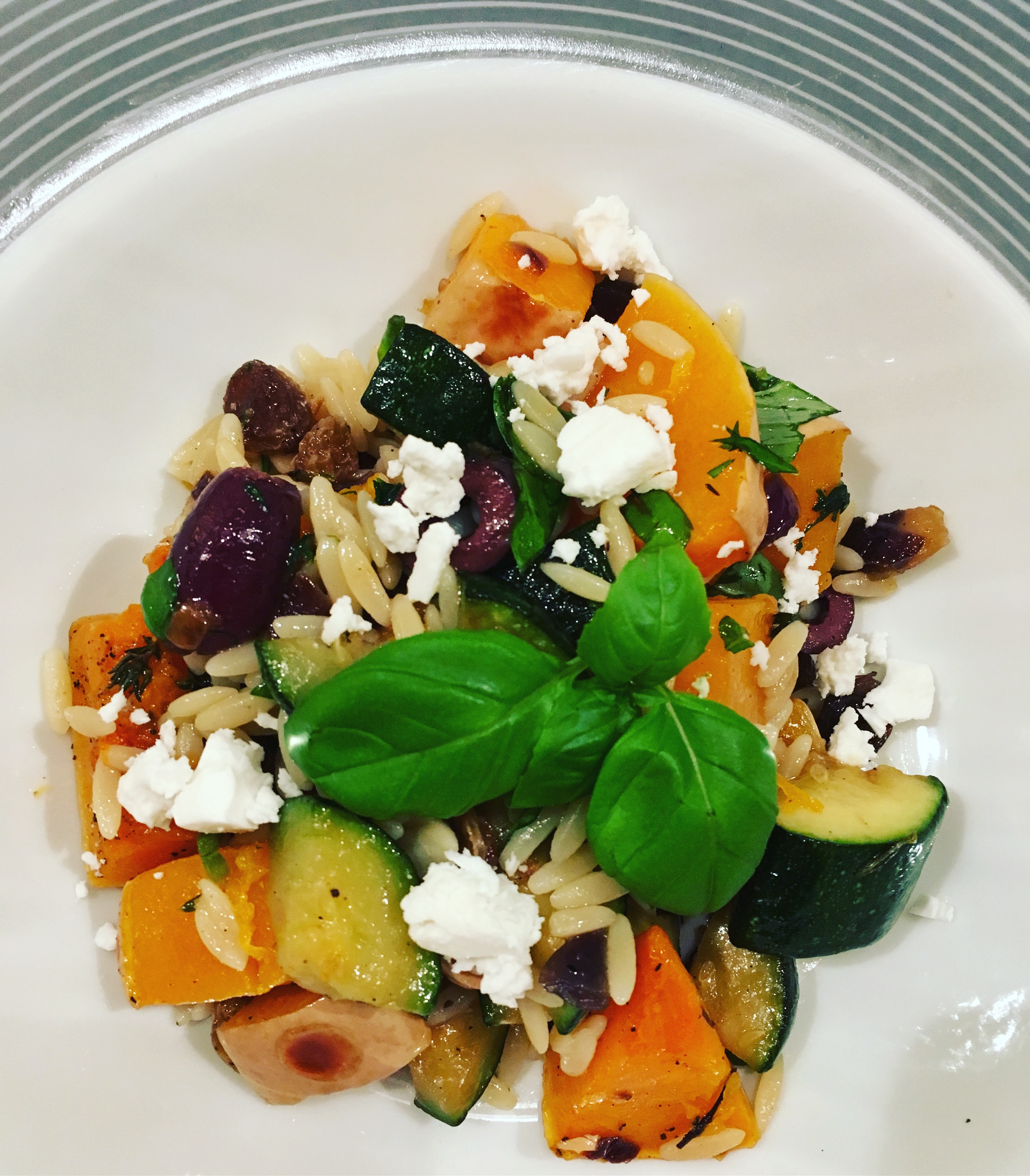 Farrosalade met rode ui, artisjok, courgette, munt en geitenkaas