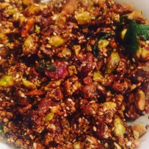 Farrosalade met rode ui, artisjok, courgette, munt en geitenkaas