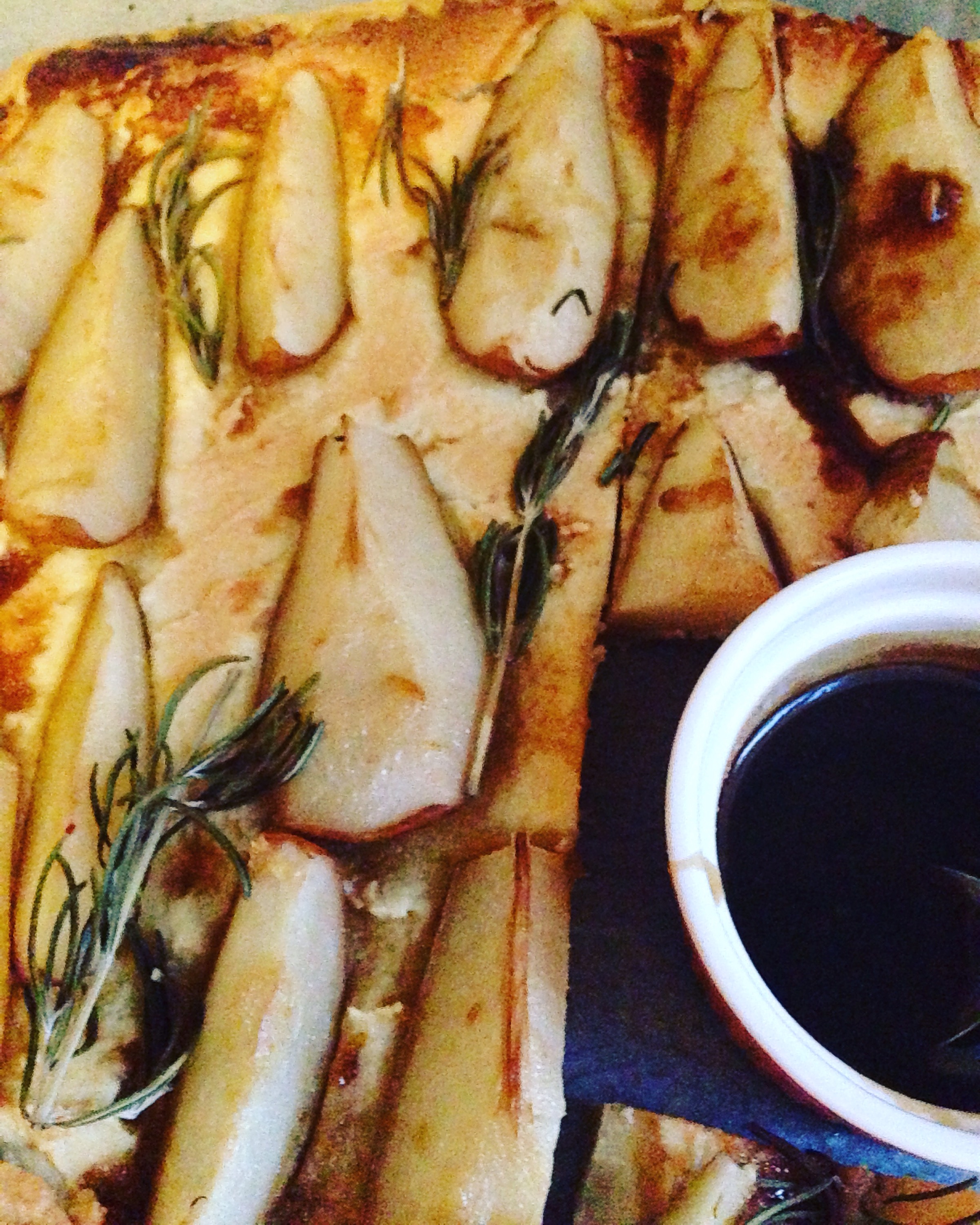 Smeer met een kwastje de peren in met de siroop en houd de rest apart. Strooi de takjes rozemarijn eroverheen en bak de taart ongeveer 40 minuten in de oven. Laat afkoelen en lepel de rest van de siroop eroverheen (deze is als het goed is wat dikker geworden). Snijd de plaattaart in vierkante stukken.