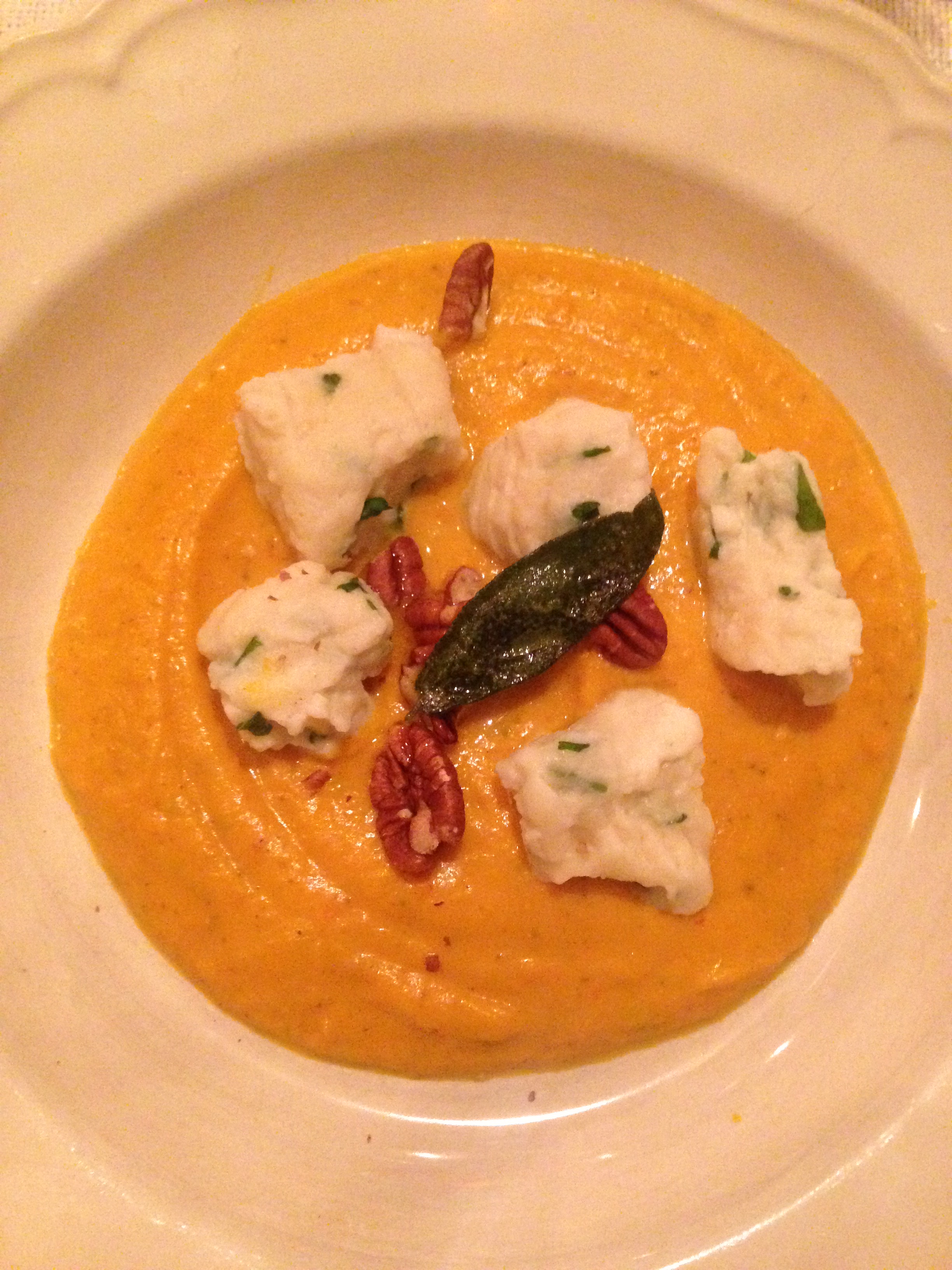 Voeg na een half uur aan de pompoen de boter, een snufje nootmuskaat en wat zout en peper toe. Pureer in een keukenmachine of blender of met de staafmixer tot een gladde saus. Schep in soepborden een paar schepjes pompoencrème en schep de gekookte gnocchi daar op. Verbokkel wat pecannoten erboven en schep een beetje salieboter over het gerecht. Buon appetito!
