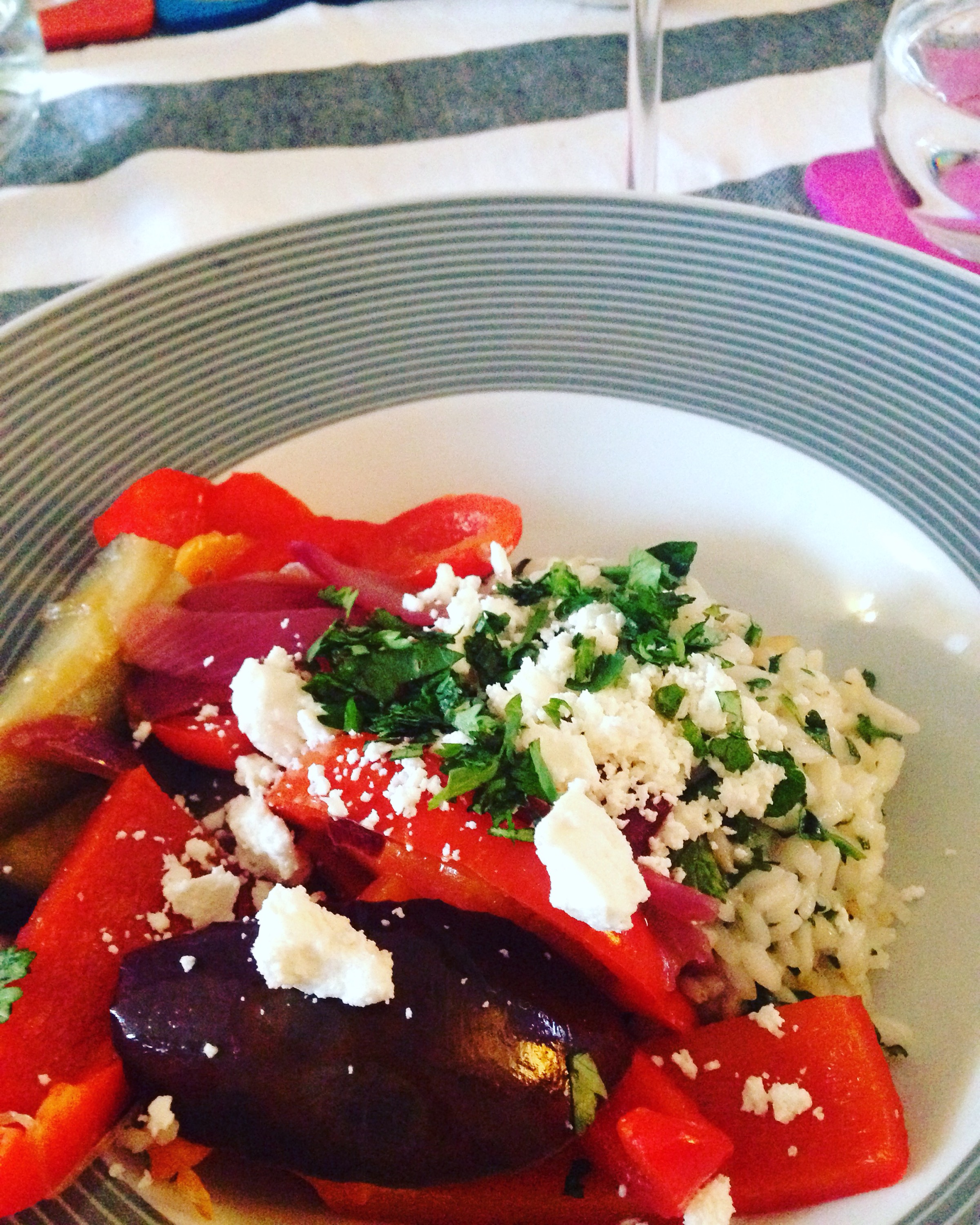 Verhit wat olie in de pan en bak de paprika, aubergine en rode ui. Voeg na een paar minuten de suiker en de azijn toe. Vergeet ondertussen de bouillon niet toe te voegen aan de risotto!