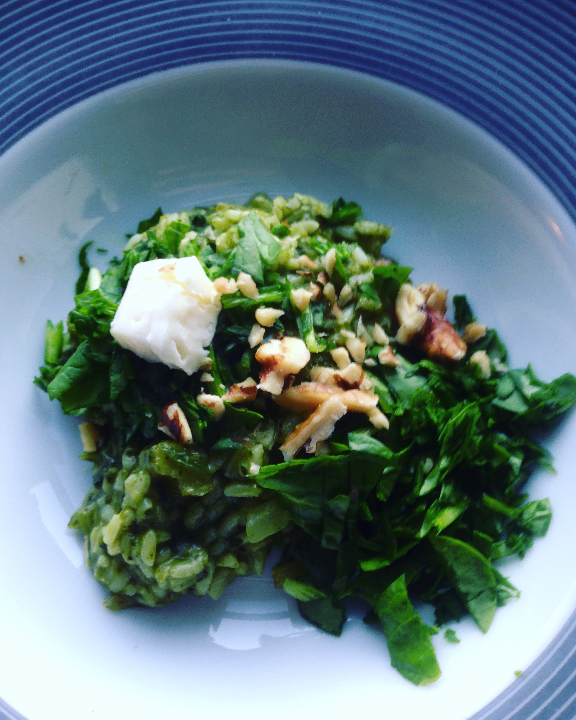 Serveer de risotto met de gesneden spinazie erover en wat verkruimelde stukjes apart gehouden gorgonzola. Breng op smaak met peper en zout en maak af met een handje gehakte walnoten.