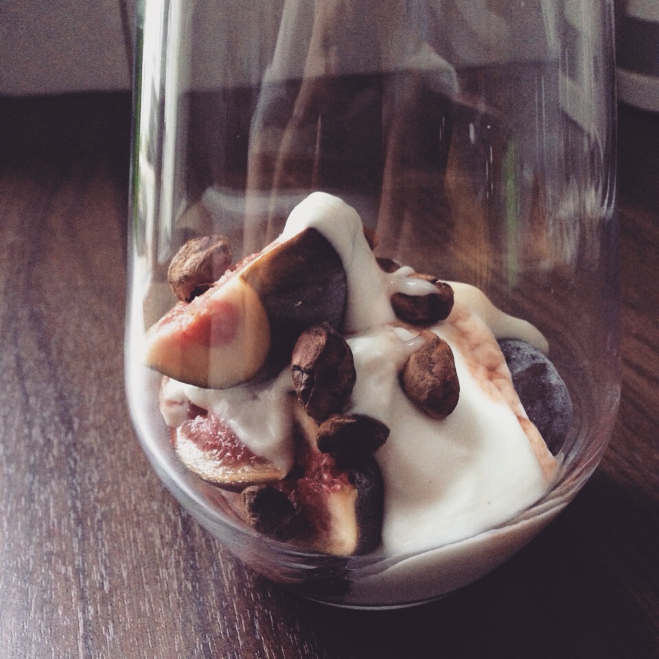 Dit is een heel leuk alternatief op een kaasplankje, want het bevat én kaas én vijgen én noten. Dit toetje houdt het midden tussen hartig en zoet. Precies goed dus. Laat je overigens niet afschrikken door de chique naam van dit toetje. Het betekent niets meer en niets minder dan ‘opgebouwd uit lagen’. En dat valt eigenlijk wel mee, want het wordt een heerlijke potpourri van yoghurt, saus, vijgen en nootjes.