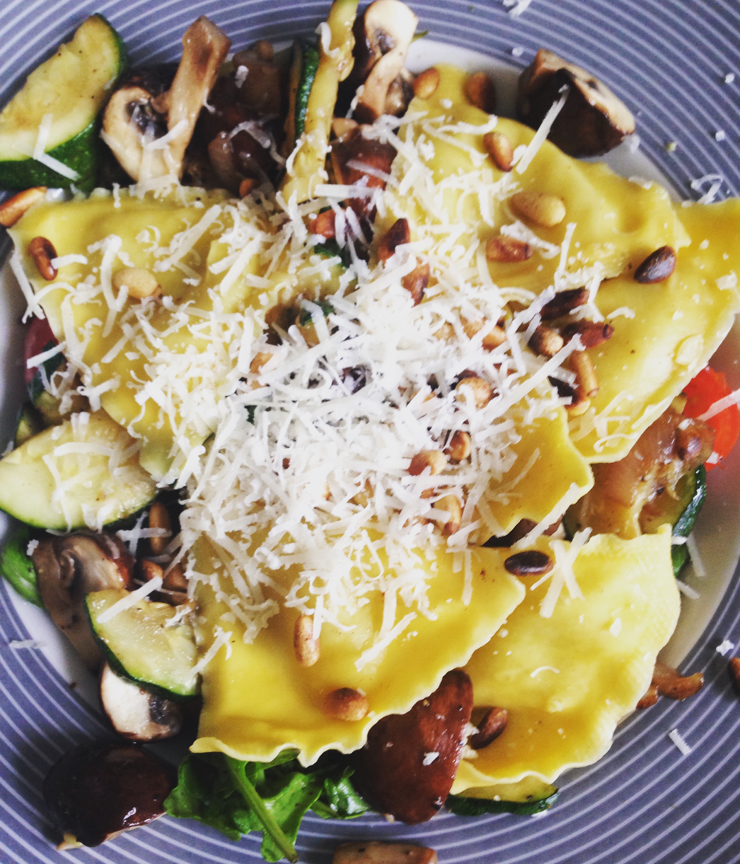 Rooster eerst in een droge koekenpan de pijnboompitjes en leg deze als ze mooi bruin zijn even apart. Versnipper het sjalotje. Snijd de courgette in halve maantjes en de champignons in halve delen. Breng water aan de kook in de kookpan. Doe een el olie in de koekenpan en bak eerst de sjalotjes en de courgette. Voeg, als de courgette al wat zachter begint te worden, de champignons toe. Lekker kruiden met peper en zout. Ik vind flink wat peper heerlijk bij dit gerecht, maar smaken verschillen natuurlijk! Gooi daarna de cherrytomaatjes erbij en verwarm die totdat ze een beetje ‘uit hun velletje knappen’. Kook ondertussen de pasta in ongeveer drie minuten. Langer hoeft echt niet en dan valt de ravioli ook uit elkaar. Verdeel de rucola over de borden, schep daar de groenten overheen en eindig met de pasta. Rasp vervolgens wat Parmezaanse kaas over de ravioli (dan smelt ’t lekker!) en garneer het geheel met pijnboompitjes.